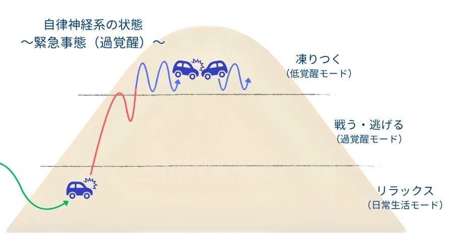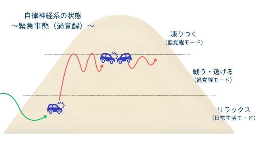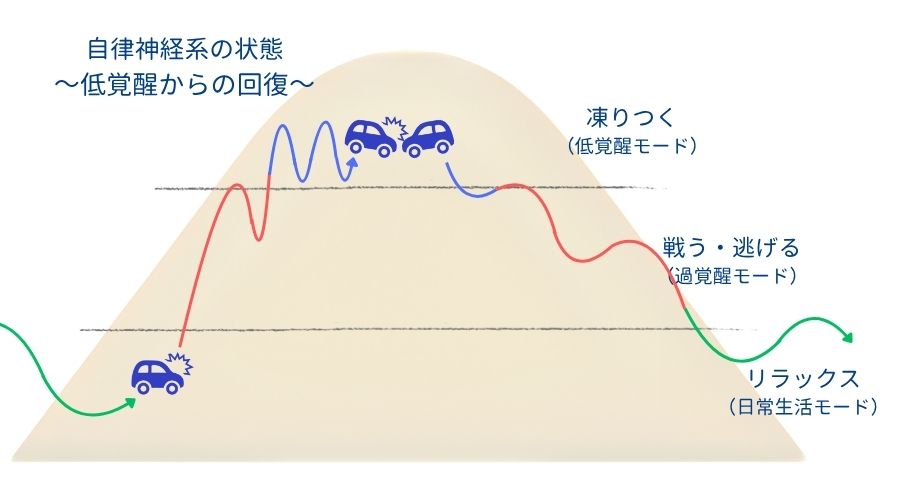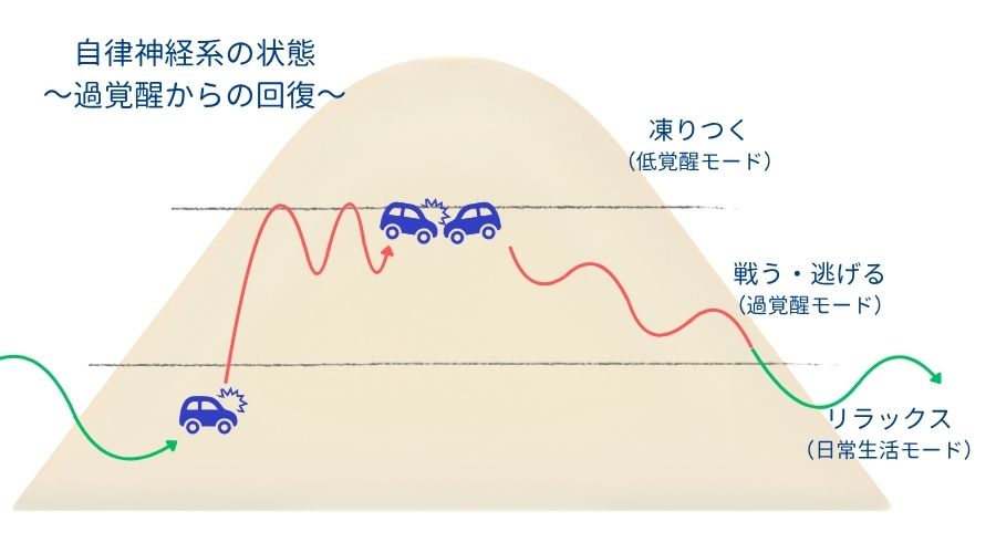 事故の後、しばらくの間はケガの治療が必要であったり、肉体的・精神的に不安定になることもあると思います。しかし、時間の経過や周囲のサポート、運転へ少しずつ不安を乗り越えながら再チャレンジをすることなどを通して、事故のときに働いていた自律神経の“サバイバルモード”が“日常生活モード”へ落ち着いていく人もいるでしょう。回復の道のりは元々その人が持っている神経反応パターンや回復力の強さなど個人差があります。