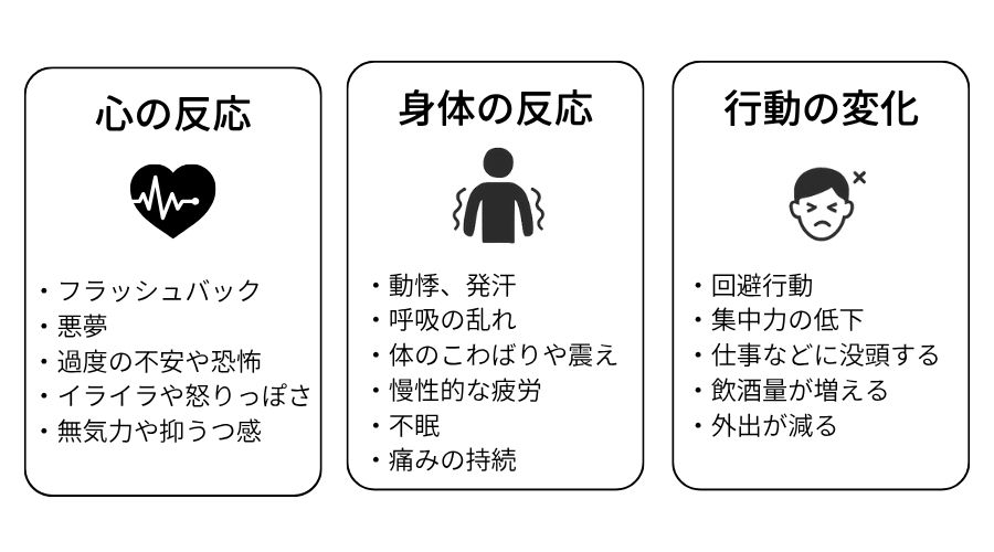 運転に対する不安や怖さだけでなく、身体的な反応や行動の変化として出てくるトラウマ反応は下記のようなものがあります。