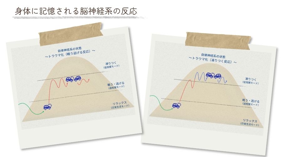 心身が順調に回復していく場合は、段階を踏みながら“サバイバルモード”から“日常生活モード”へと自然に移行していきます。しかし、このサバイバルモードが身体に残ったまま切り替わらないと、その反応がトラウマ化してしまうと言われています。