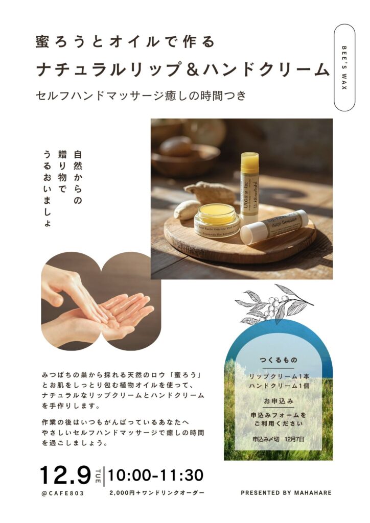 蜜ろうとオイルで作るナチュラルリップ&ハンドクリームワークショップ
